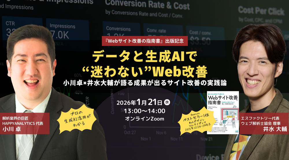 本セミナーでは、Web解析・改善の第一人者である小川卓氏と、『Webサイト改善の指南書』著者の井水大輔が、生成AIを“思考と実行のパートナー”としてどう活用するかを解説します。